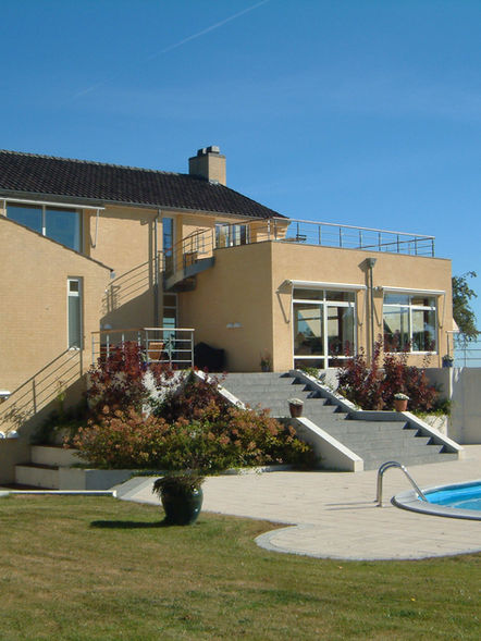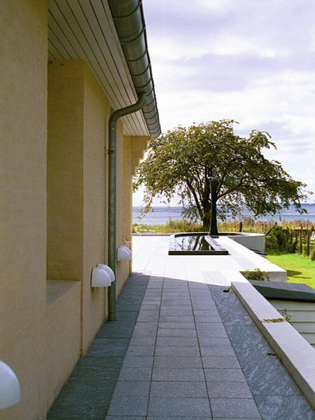 Residence located by the seaside in Denmark with beautiful views over the sea and nearby harbor. The building is sited on a plateau which lifts the level of the main floor over the dunes and creates a base for the house with terraces.